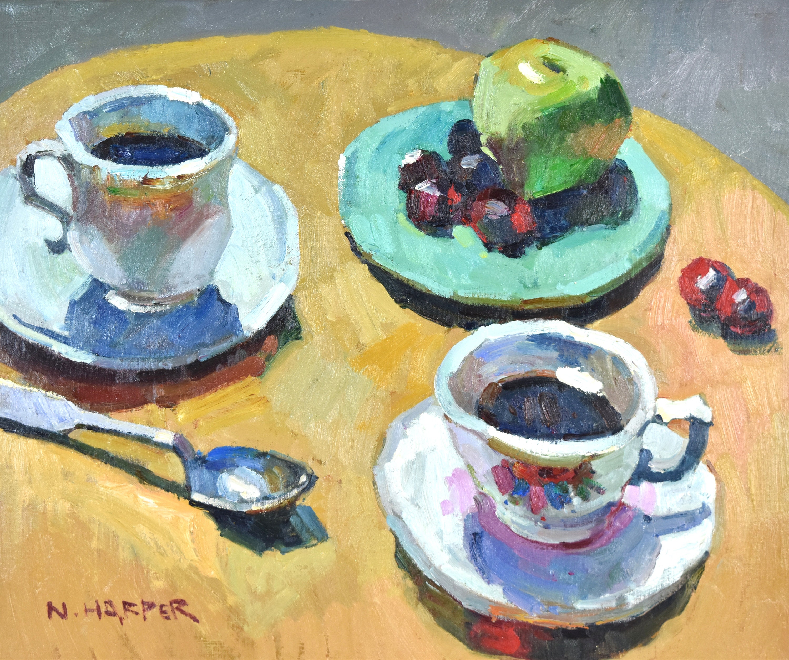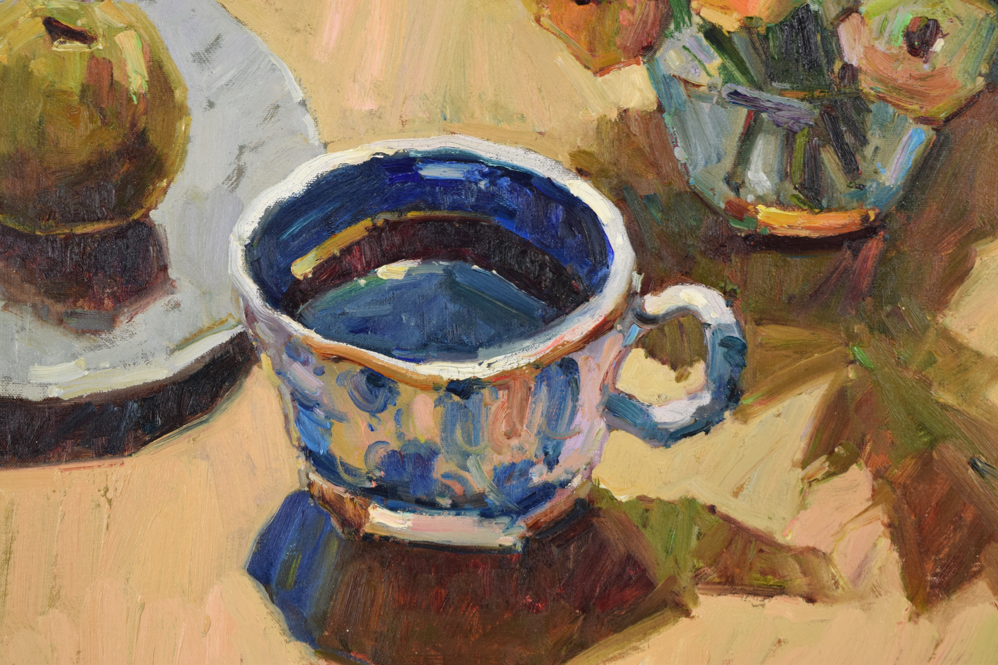 Vintage Impressionist Still Life Oil Painting Teacups With Apple And Cherries Sgd Harper