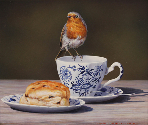 Wayne Westwood Original Oil Painting On Panel Robin On A Tea Cup Art To Buy Online Ref Wawes902
